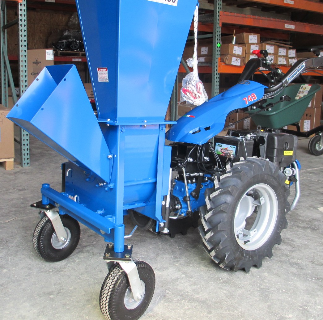 Earth Tools now provides the BIO-100 and BIO-150 units with “high-floatation” caster wheels STANDARD EQUIPMENT (previously a $105 additional cost). These roll much better on rough & uneven ground than the old “standard” wheels. The only potential “downside” to these is that the large casters make the chipper sit “up” higher, so if your walk-behind tractor is equipped with relatively small wheels (4x10x18”or smaller), the machine may actually “lean back” toward the tractor so much that engine clearance becomes an issue. In this case, feel free to request the “standard” (5” dia., 1.25” wide) wheels on your chipper…we are happy to provide them instead.